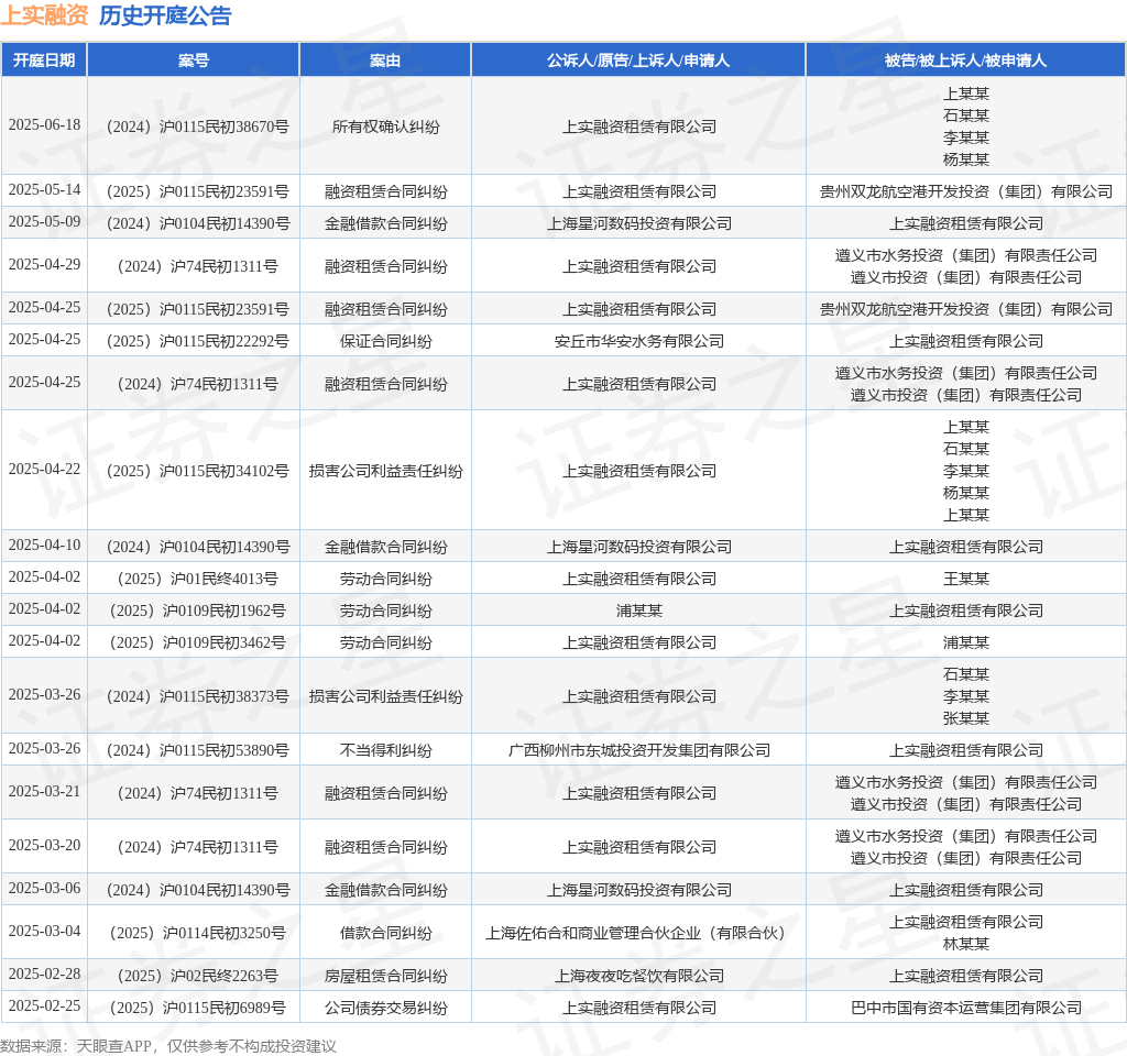 案号:(2025)沪0115民初23591号审理法院:上海市浦东新区人民法院案由:融资租赁合同纠纷当事人信息: 原告/上诉人:上实融资租赁有限公司 被告/被上诉人:贵州双龙航空港开发投资(集团)有限公司开庭日期:2025年5月14日根据统计,近一年内以上实融资租赁有限公司为当事人的历史开庭公告有53则,其中案由为“融资租赁合同纠纷”的公告以19则居首,其次为“损害公司利益责任纠纷”有6则,“金融借款合同纠纷”有4则。历史开庭公告(前20条)如下: